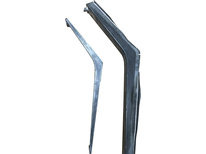切邊拉出的較高的縱毛刺的經(jīng)后序校正壓入鍛件本體形成的折疊,扭拐成形的曲軸在校正時(shí)易出現(xiàn)此類折疊,切邊后水平分模面位置的毛刺經(jīng)扭拐后轉(zhuǎn)到校正模的上下模的型槽內(nèi)的位置,熱校正后較長(zhǎng)的毛刺壓入鍛件本體,形成折疊。及時(shí)替換或修理老化的切邊凹模,避免拉出較高的縱向毛刺就可避免此類缺陷。